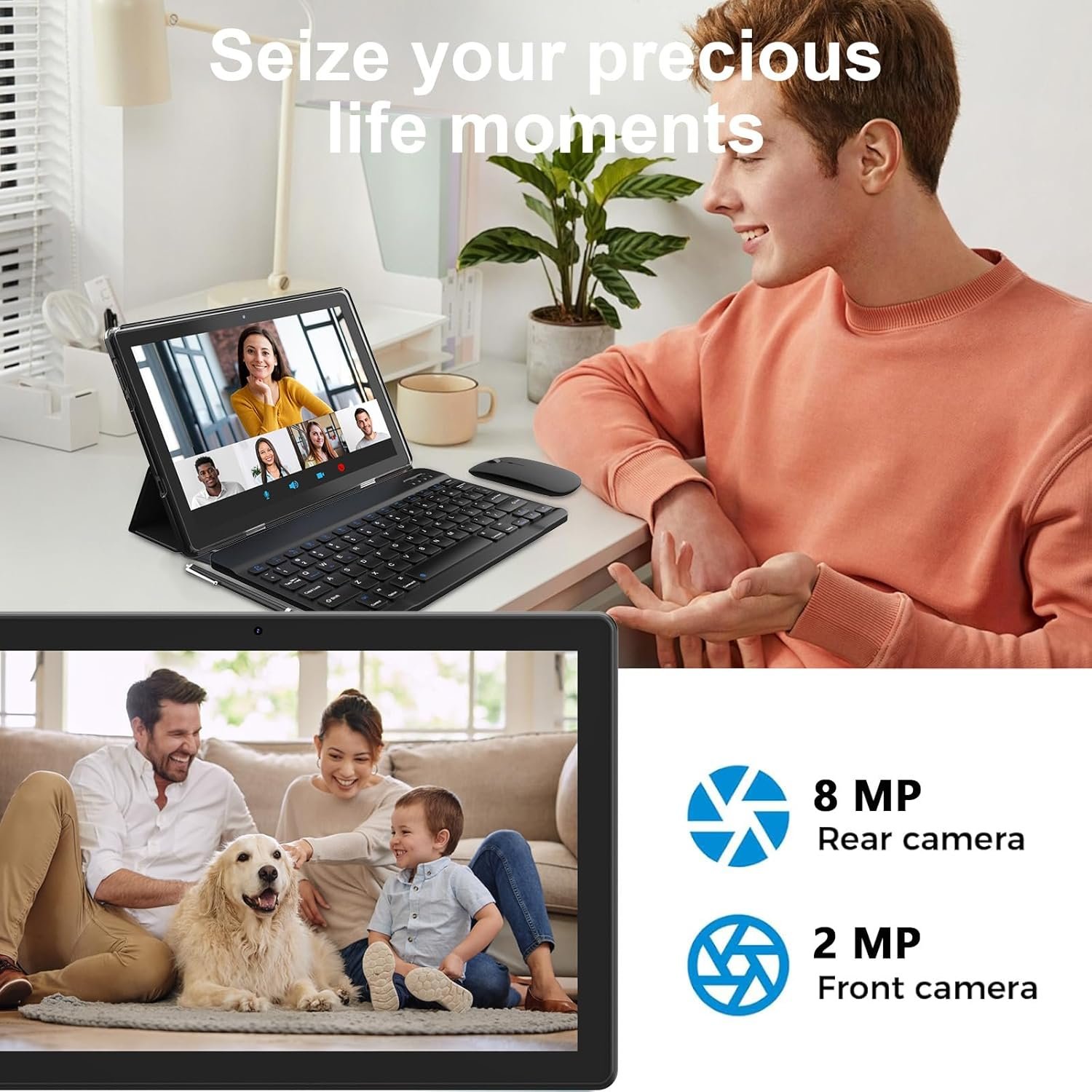 Udstyret med et 2MP frontkamera og et 8MP bagkamera tager denne tablet klare billeder og videoer, hvilket gør den perfekt til at dele øjeblikke på farten.