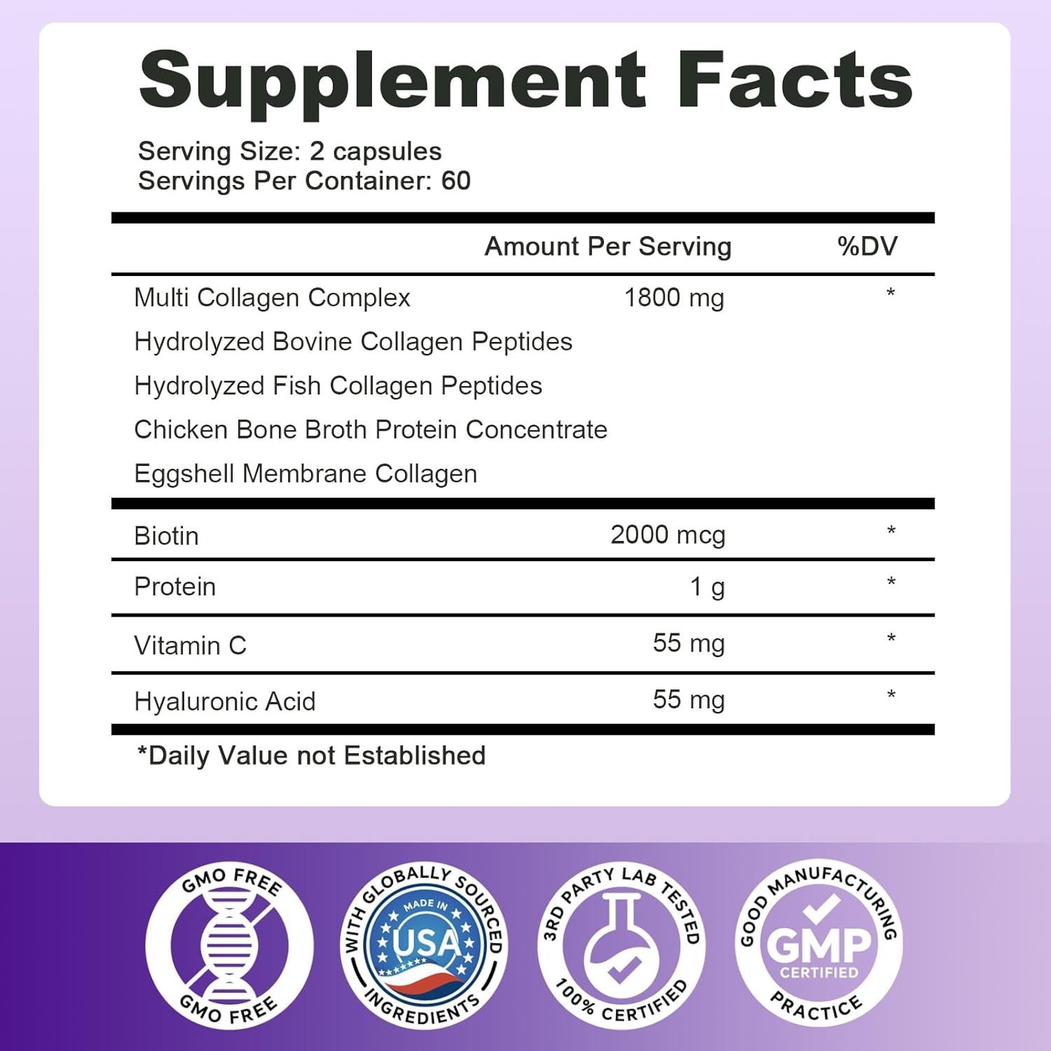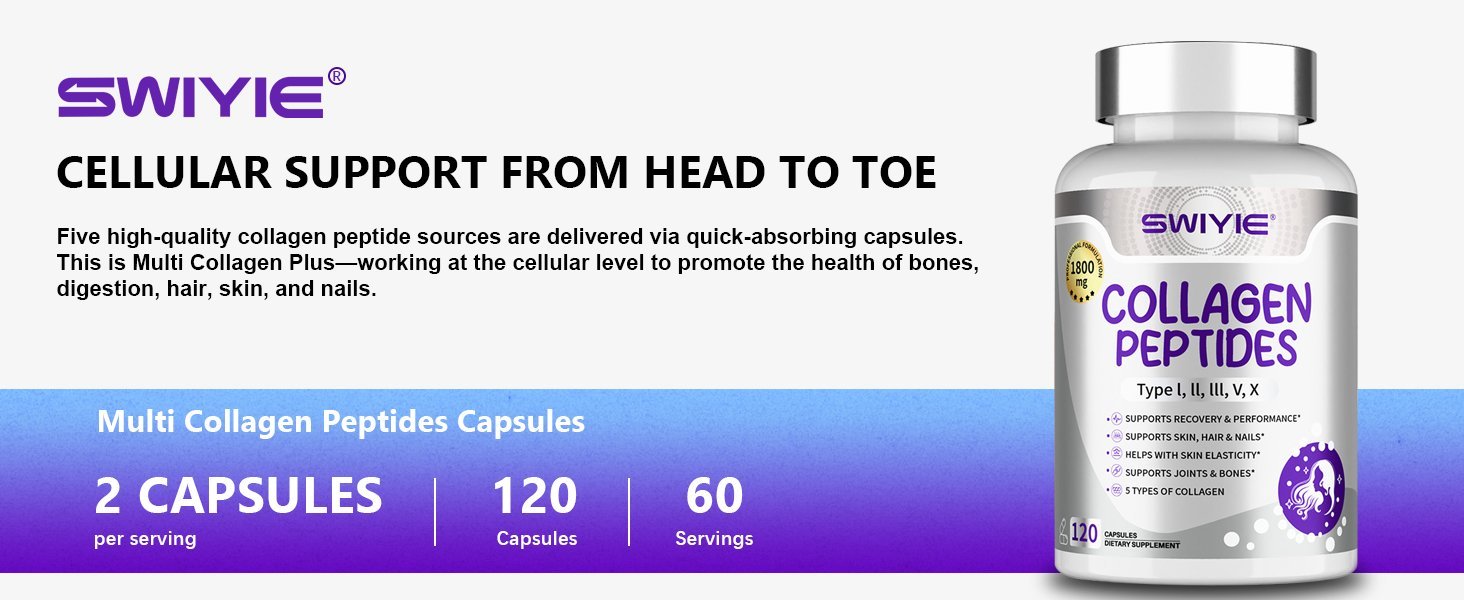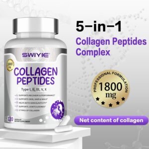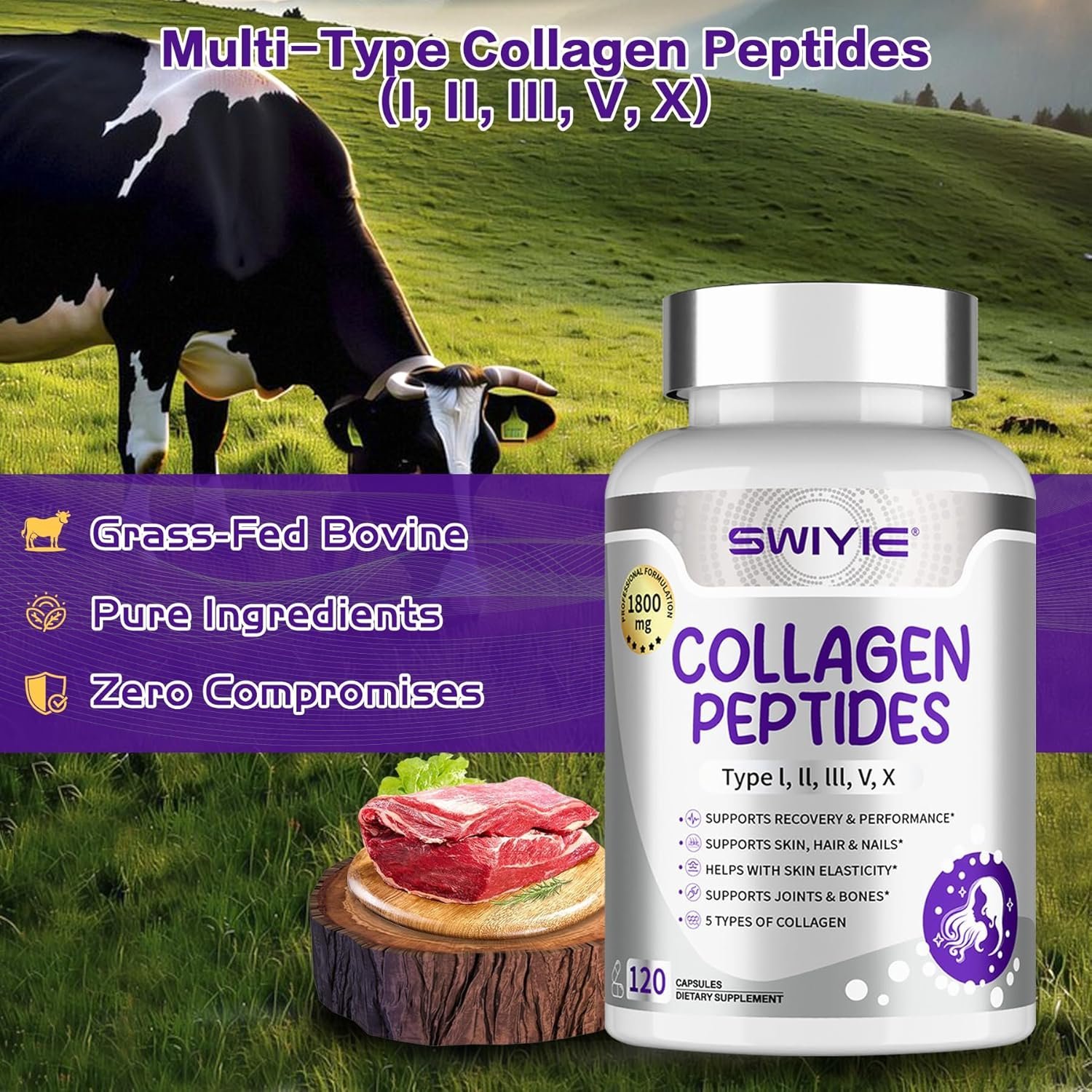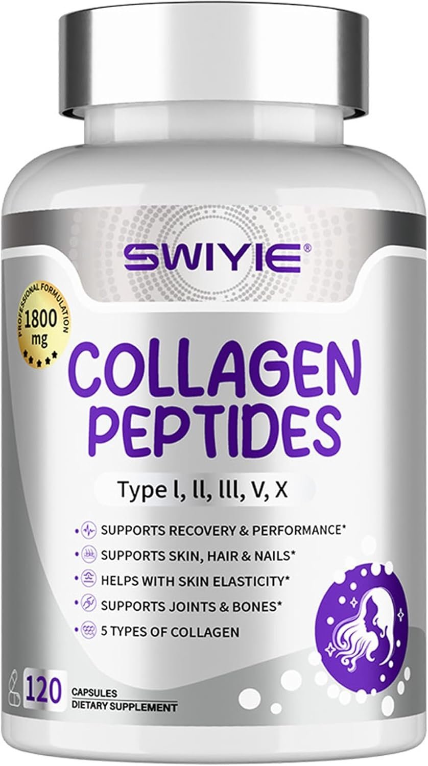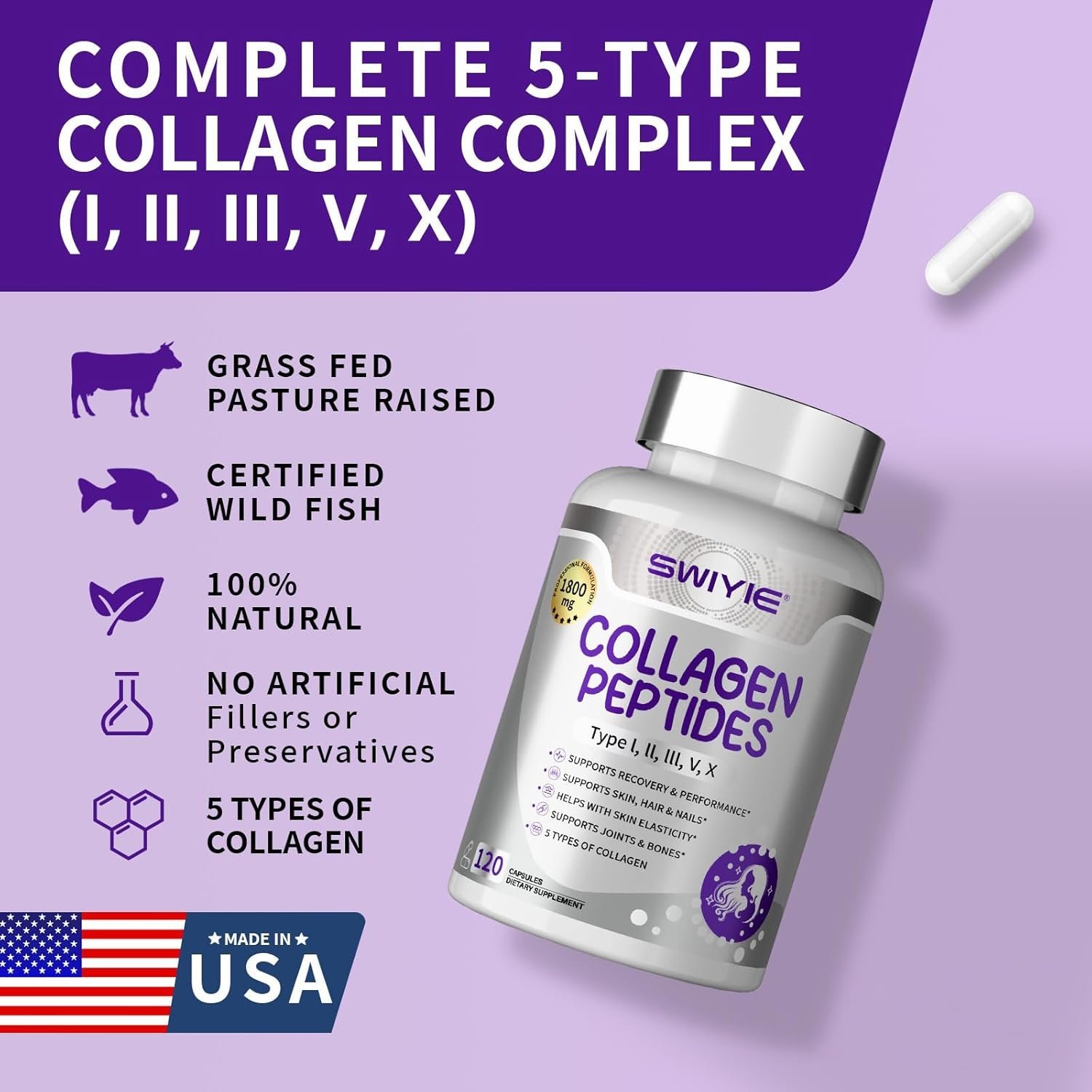 SWIYIE Complejo de Colágeno Múltiple: Péptidos Hidrolizados Tipo I, II, III, V,X. Apoyo para Piel, Cabello, Uñas y Articulaciones. Sin Sabor, Sin OGM, Sin Gluten. 120 Cápsulas.